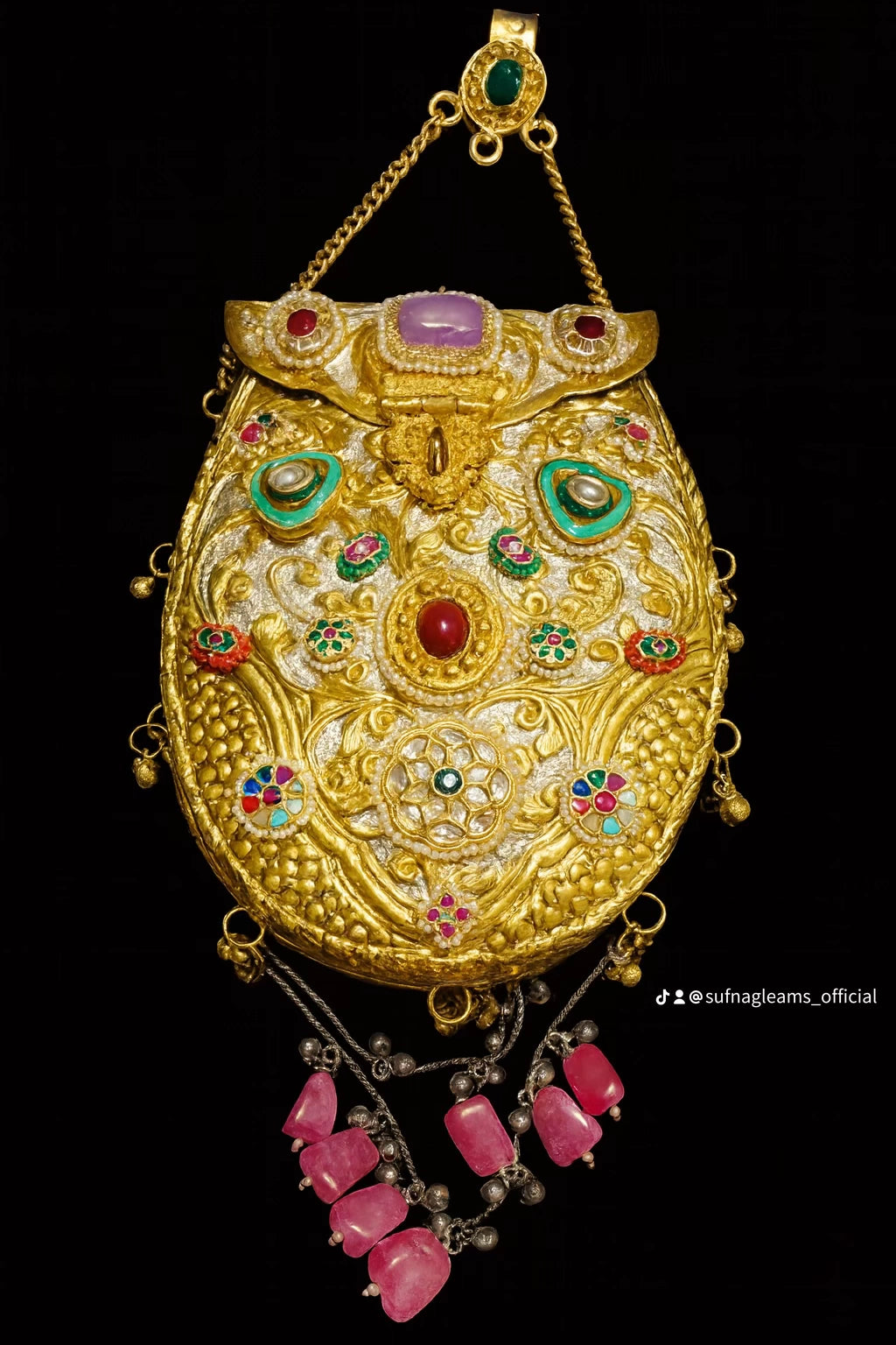 Introducing Raaha fusion Bag - a stunning blend of metal clutch and beautiful fusion material. With intricate motifs such as pachee kundan doublet and detailed craftsmanship, this bag exudes elegance and style. Perfect for any occasion, add a touch of sophistication to your outfit with Raaha fusion Bag.